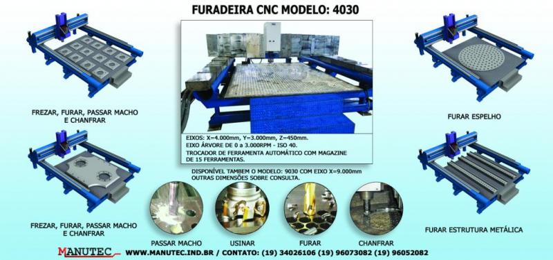 Antes de escolher onde comprar furadeira CNC, é importante encontrar uma empresa que ofereça variedade de modelos, como o 4030 e o 9030. Sendo que o primeiro possui X-4000 mm, Y-3000 mm e Z-450 mm, além de dimensões com um eixo árvore de potência para funcionar de 0 a 3000 RPM cone ISO 50 e cone ISO 40. Por outro lado, o modelo 9030 deve conter x-9000 mm, y-3000mm e z-450mm.